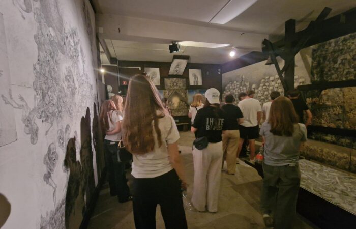Später am Tag besuchten wir die Ausstellung des Künstlers Marian Kołodziej, der als Auschwitz-Überlebender seine Erfahrungen in intensiven, symbolhaften Zeichnungen verarbeitet hat. Bis zu seinem 55 Lebensjahr hat er seine Geschichte mit niemandem geteilt, doch nach einem Schlaganfall entschied er sich über das Trauma, das ihm widerfahren ist, zu erzählen. Der gelernte Künstler möchte mit seinen Werken keinen Appel setzten oder gegen etwas kämpfen, er möchte sein Trauma verarbeiten.