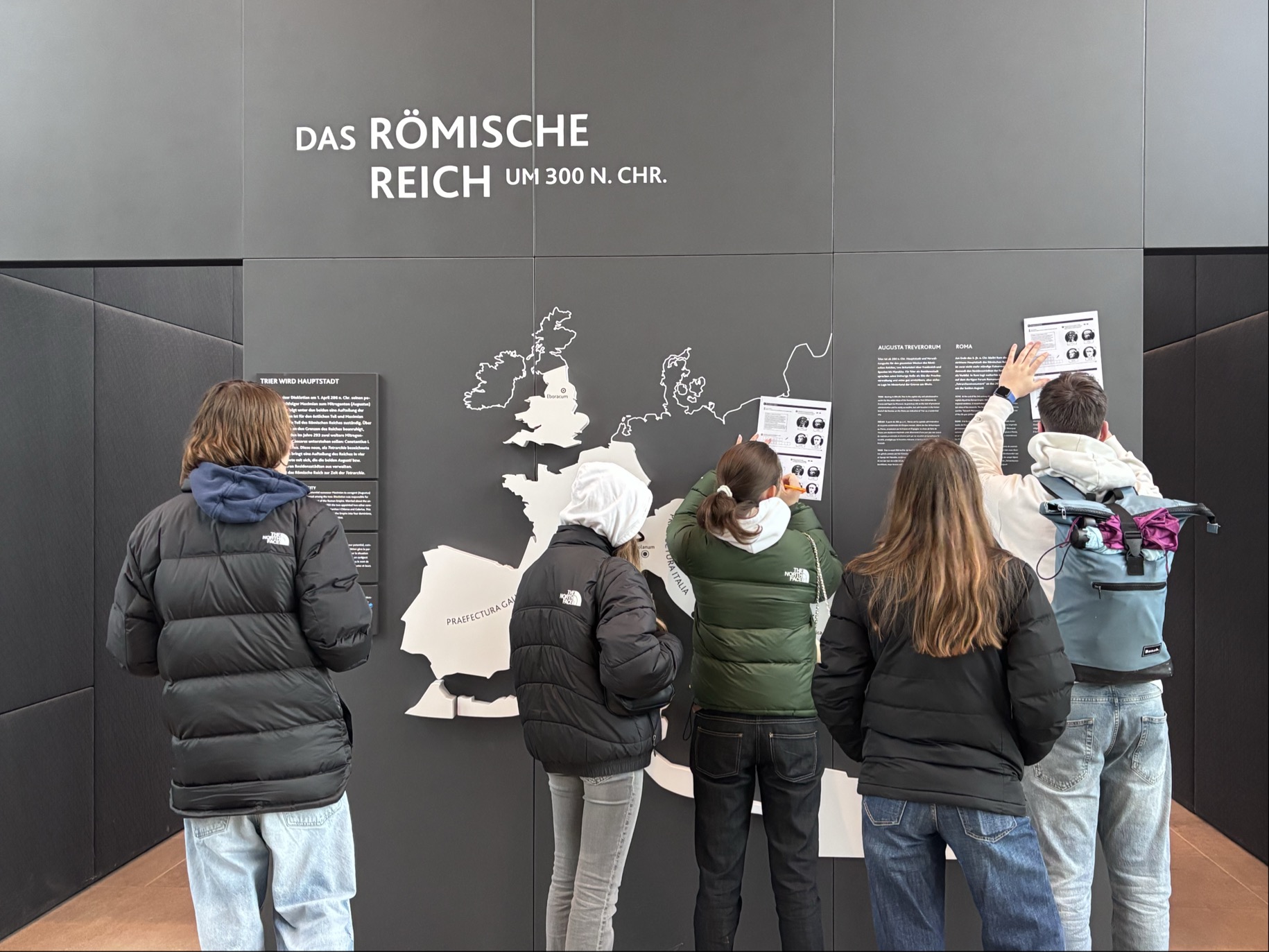 Die Französisch-Gruppe besuchte das Stadtmuseum und nahm an der Führung „Trier unter der Trikolore“ teil. Der Schwerpunkt lag dabei ganz klar auf der französischen Zeit der Stadt: Wir beschäftigten uns vor allem mit der Herrschaft Napoleons und lernten, wie stark diese Phase Trier und die gesamte Region politisch, gesellschaftlich und kulturell geprägt hat. Anschließend ging es zu den Kaiserthermen, wo die Schülerinnen und Schüler bei einer Rallye selbst aktiv wurden und die römische Vergangenheit eigenständig erkundeten.