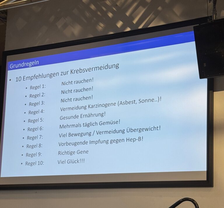 Zum Schluss machte der Pathologe deutlich, dass die soziale Krebsprävention bereits bei einem selber im Alltag beginnt: nicht rauchen, gesunde Ernährung, regelmäßige Bewegung – aber natürlich auch eine ordentliche Portion Glück!