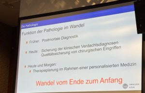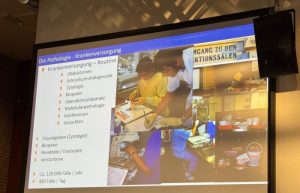 Ein weiterer wichtiger Teil seines Vortrags war der Bezug zur Künstlichen Intelligenz. Diese habe ein großes Zukunftspotenzial in der Krebsforschung, etwa bei der Auswertung von großen Datenmengen oder bei der Entwicklung individueller Therapieansätze. Jedoch, so betonte er, müsse KI noch viel lernen, weswegen es nach ein weiter Weg zu gehen ist. Darüber hinaus wies Herr Dr. Siebolts darauf hin, dass Pathologie nicht mit Rechtsmedizin verwechselt werden sollte – dies lag ihm besonders am Herzen. Denn während Pathologie die Ursachen von Krankheiten untersucht, beschäftigt sich Rechtsmedizin vor allem mit nicht-natürlichen Todesfällen.